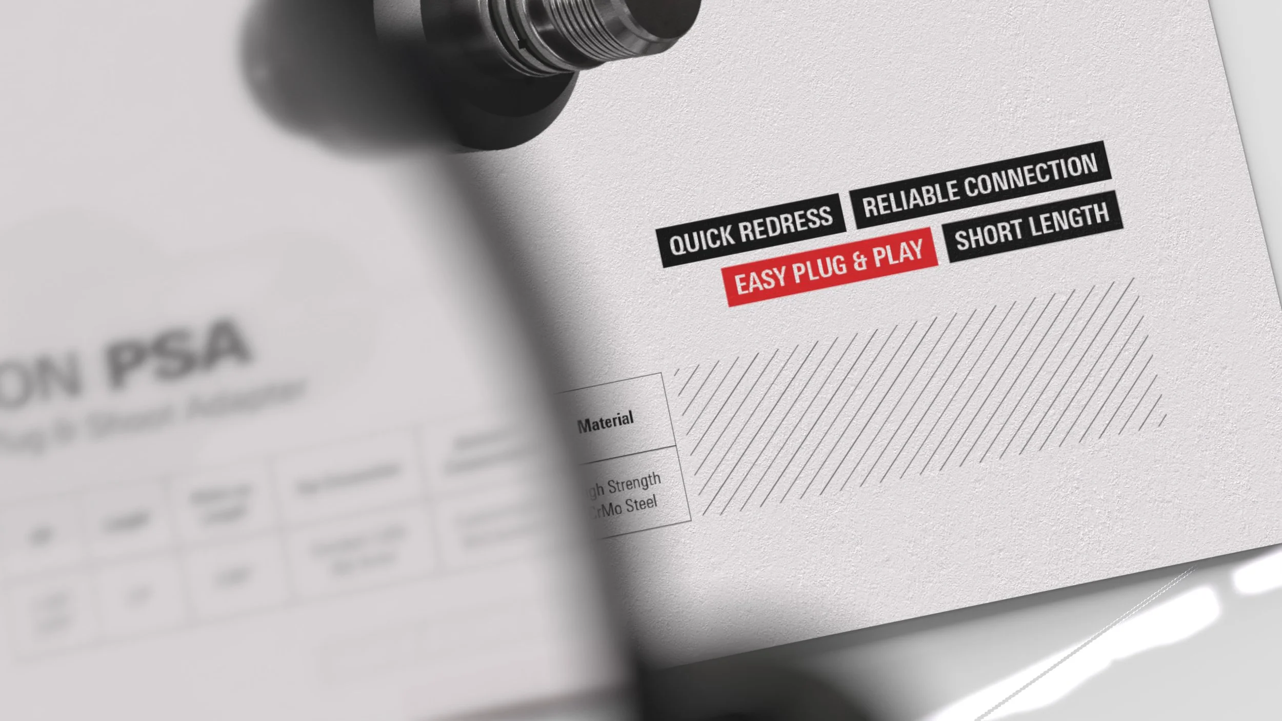 Highlighted product features in bold red accents that draw the eye to key details first, while an angled-line pattern fills the space—echoing striped metal and the precision of technical drawings.